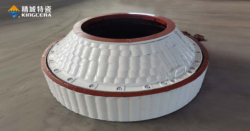 針對磨損如此嚴重的運行工況,我們推薦采用燕尾陶瓷異形結(jié)構(gòu)復合襯板防磨。具體是將燕尾形陶瓷固定到立磨鋼結(jié)構(gòu)上,耐磨陶瓷與鋼板間用耐高溫無機粘膠填充,陶瓷之間為零縫隙設計,360°錯位粘接固定工藝,縫隙相互錯開,表面光滑,可靠性大大增強,可抗沖擊,可以有效保證輥套的使用壽命延長10倍。